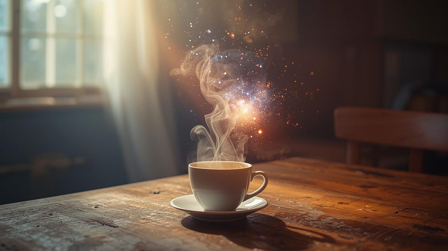Just a person. In a kitchen. On a Tuesday that’s identical to every other Tuesday. Choosing, for no reason the pattern can account for, to be here. Actually here. Not rehearsing. Not scrolling. Not looping. Just standing in the morning light with hot coffee and a cracked-open chest, attending to the moment like it matters.
